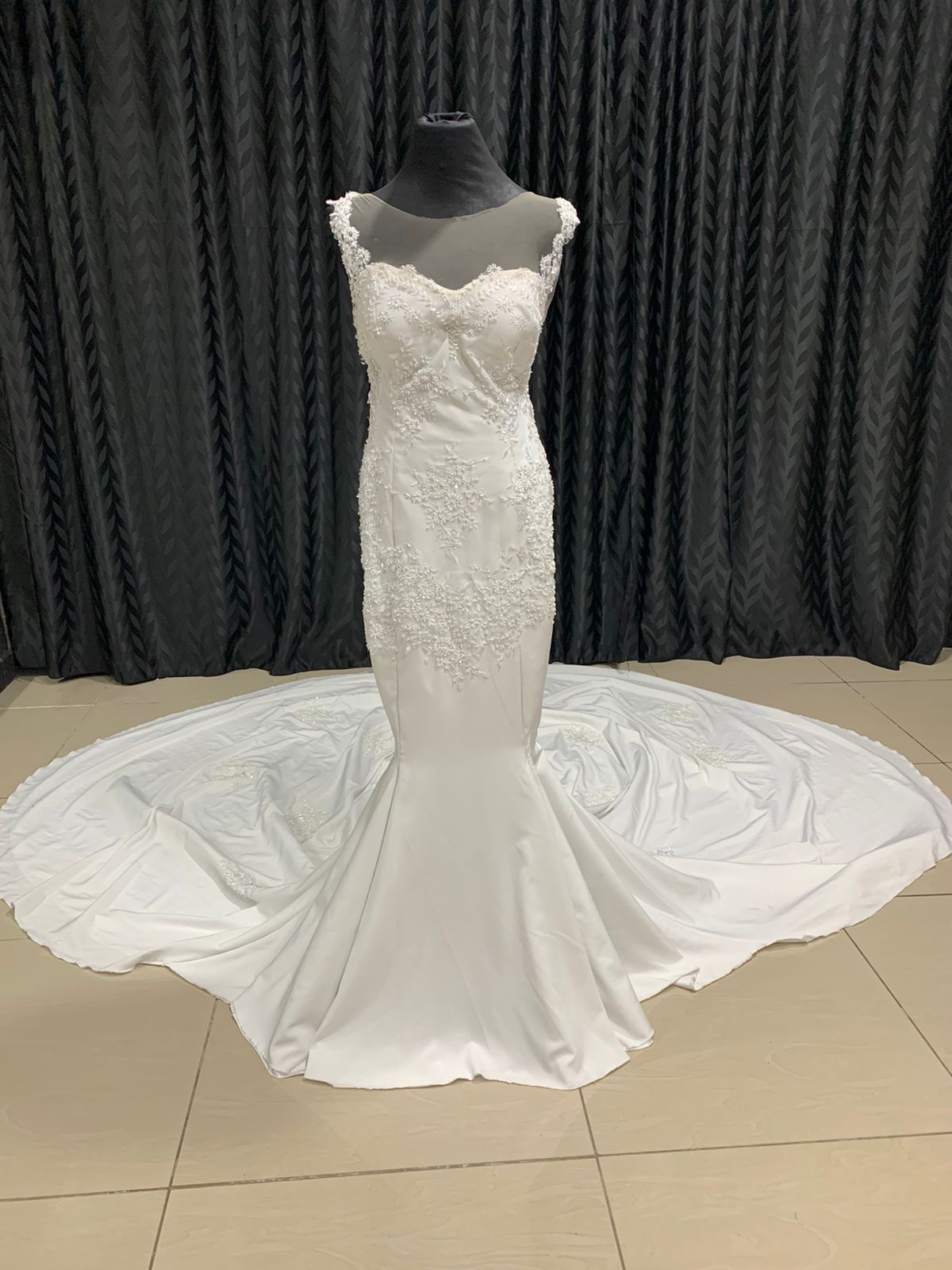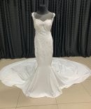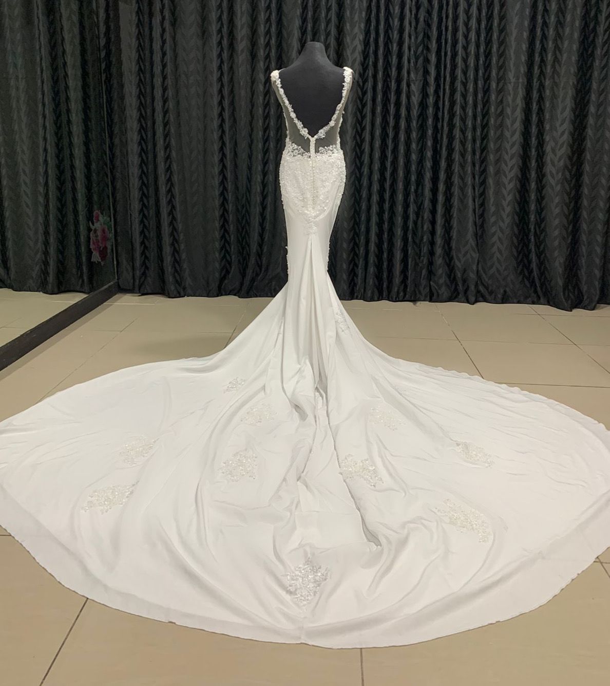 Vestido sirena con corsetería forrada en encajes, cola larga decorada y transparencia en V alta.