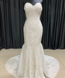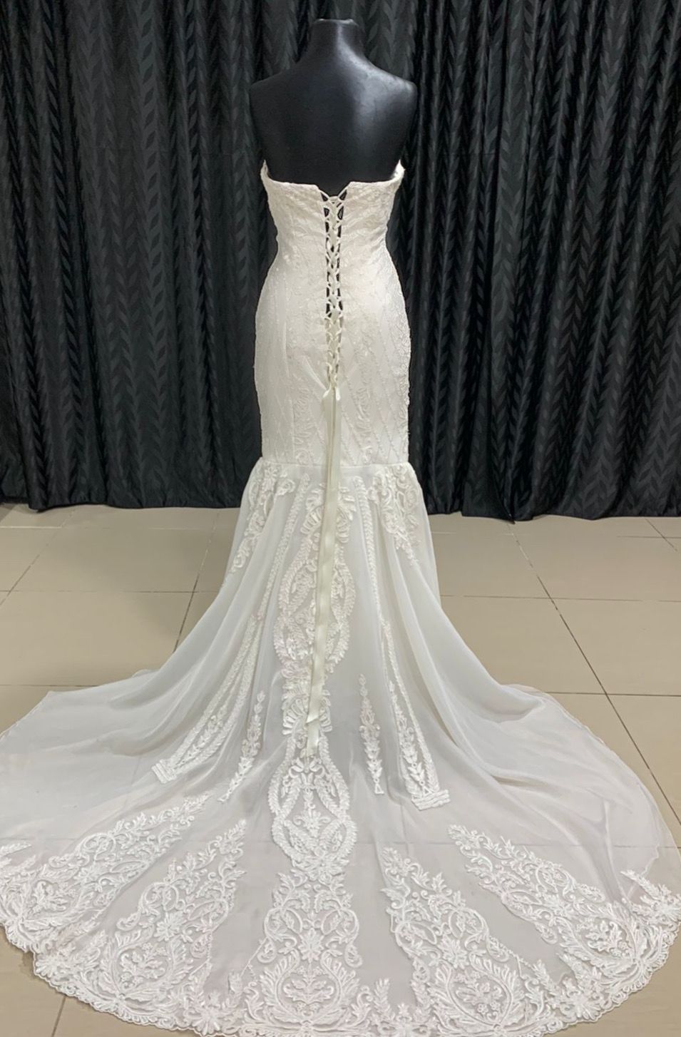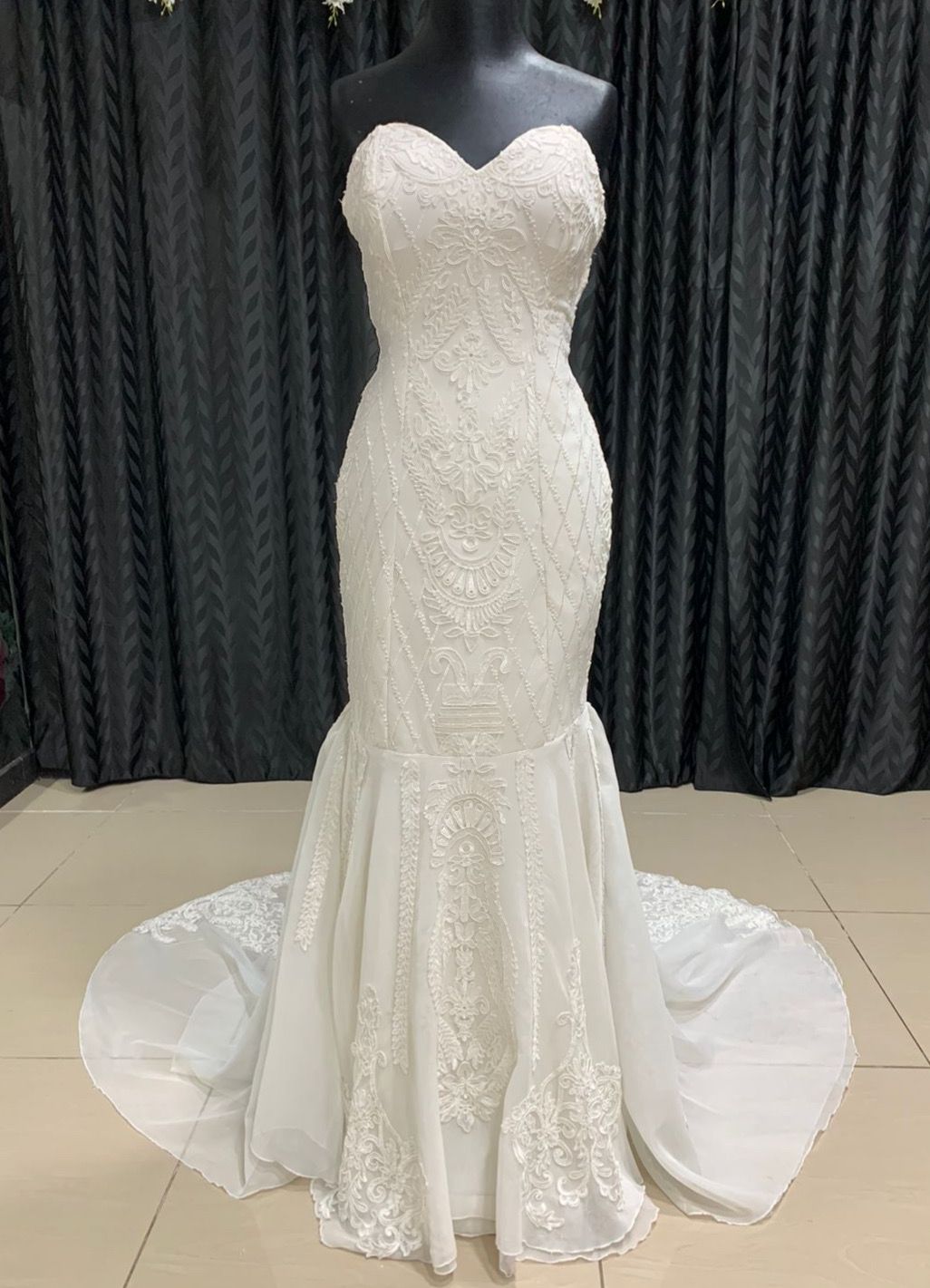 Vestido sirena todo strapless con corsetería, encajes sobrepuestos y cola decorada.