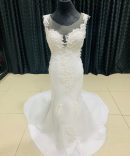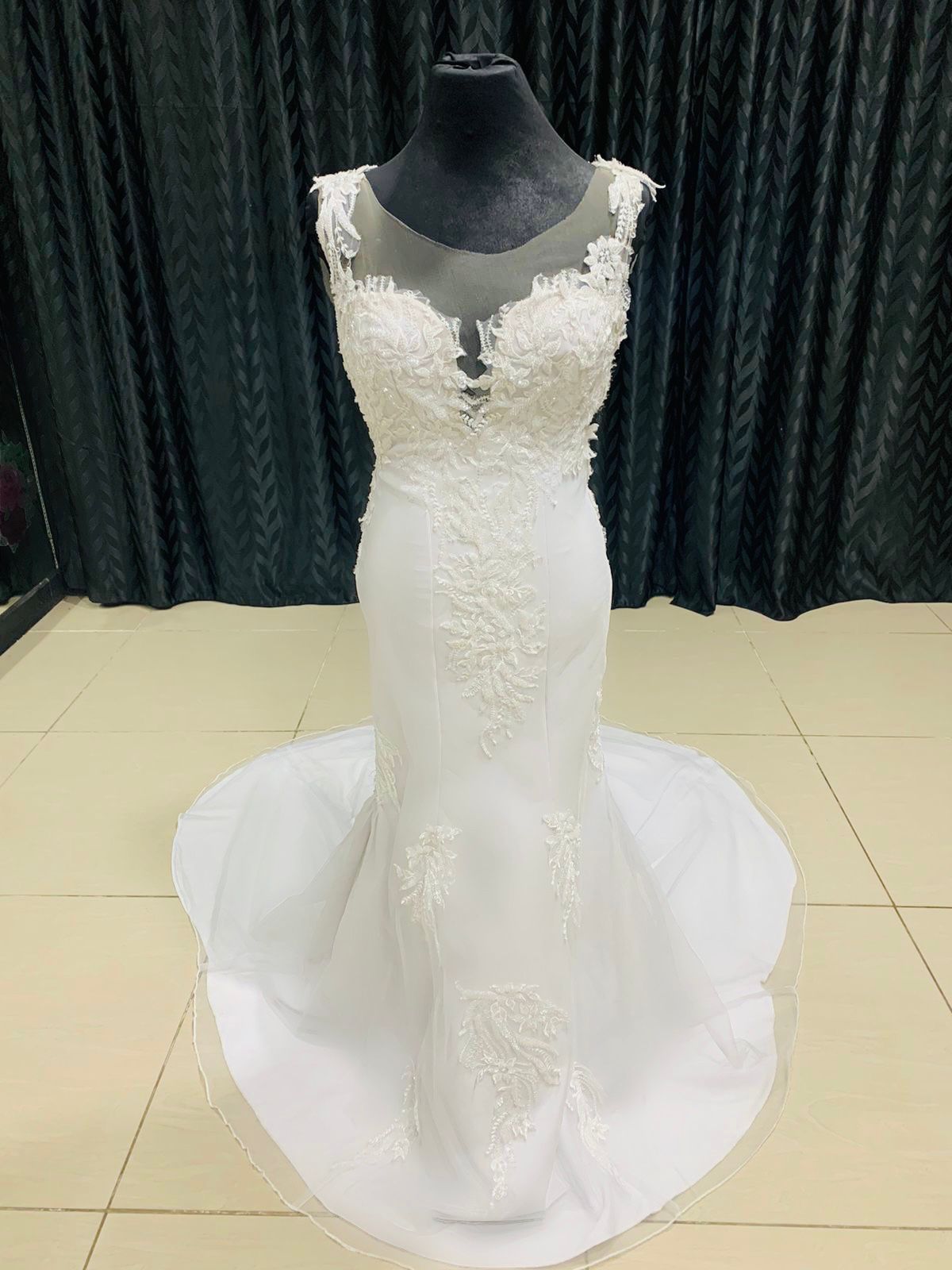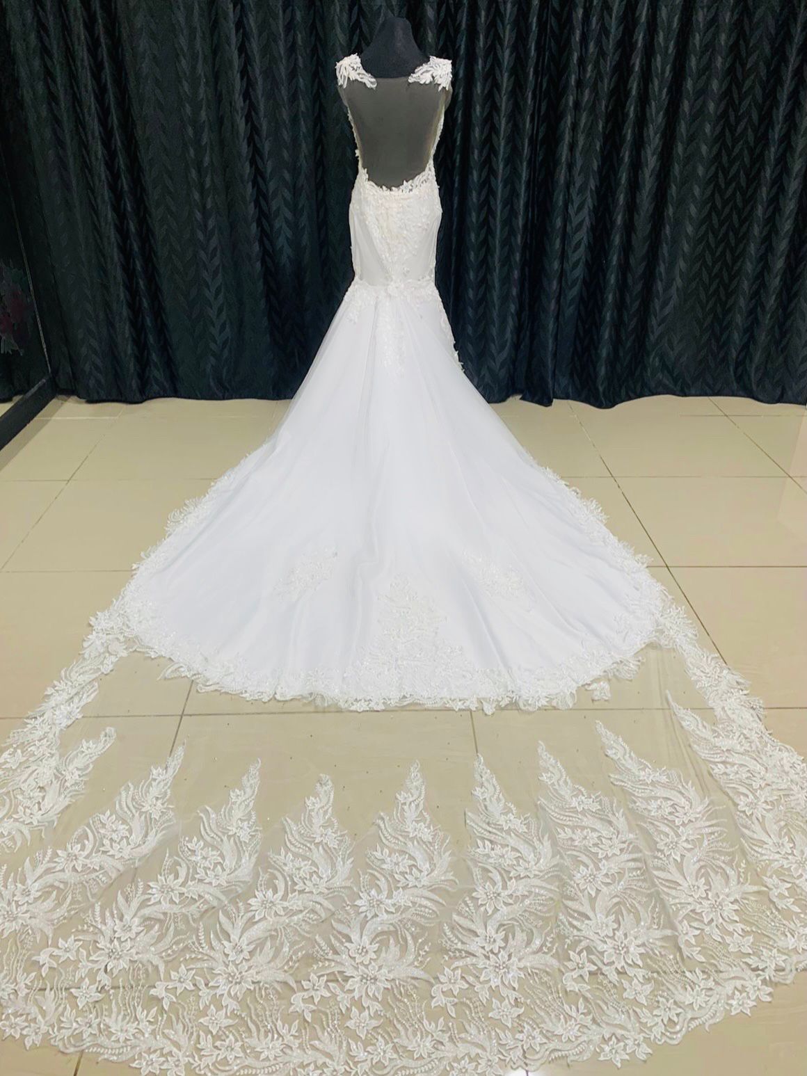 Vestido sirena hecho en tull con encajes sobrepuestos, cola corta, escote profundo y espalda baja con transparencia. Extra trae una cola decorativa.