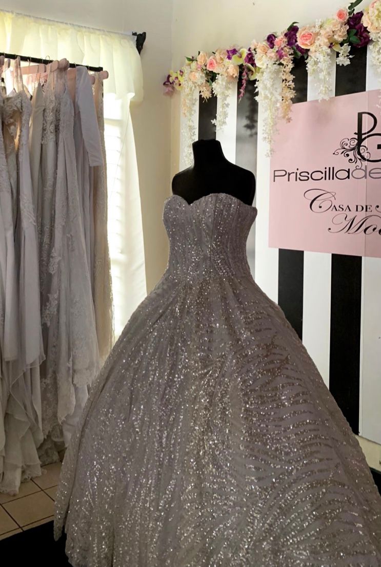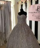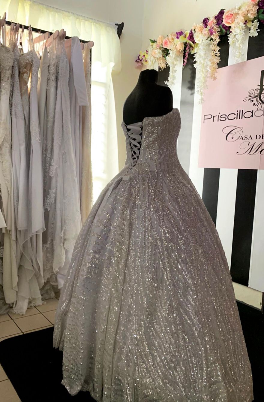 Vestido con tela de lentejuela, todo en la misma tela, con corsetería y straple.