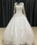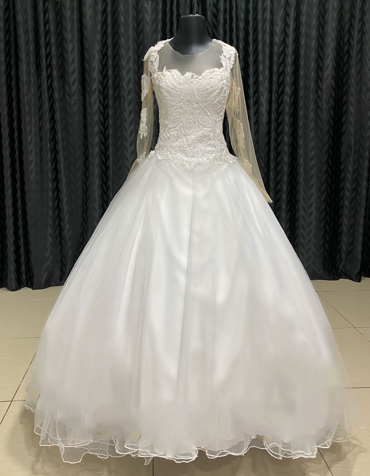 Vestido volado estilo princesa, con tull escarchado, corsetería, mangas largas y encajes sobrepuestos más cristal, con cola larga.