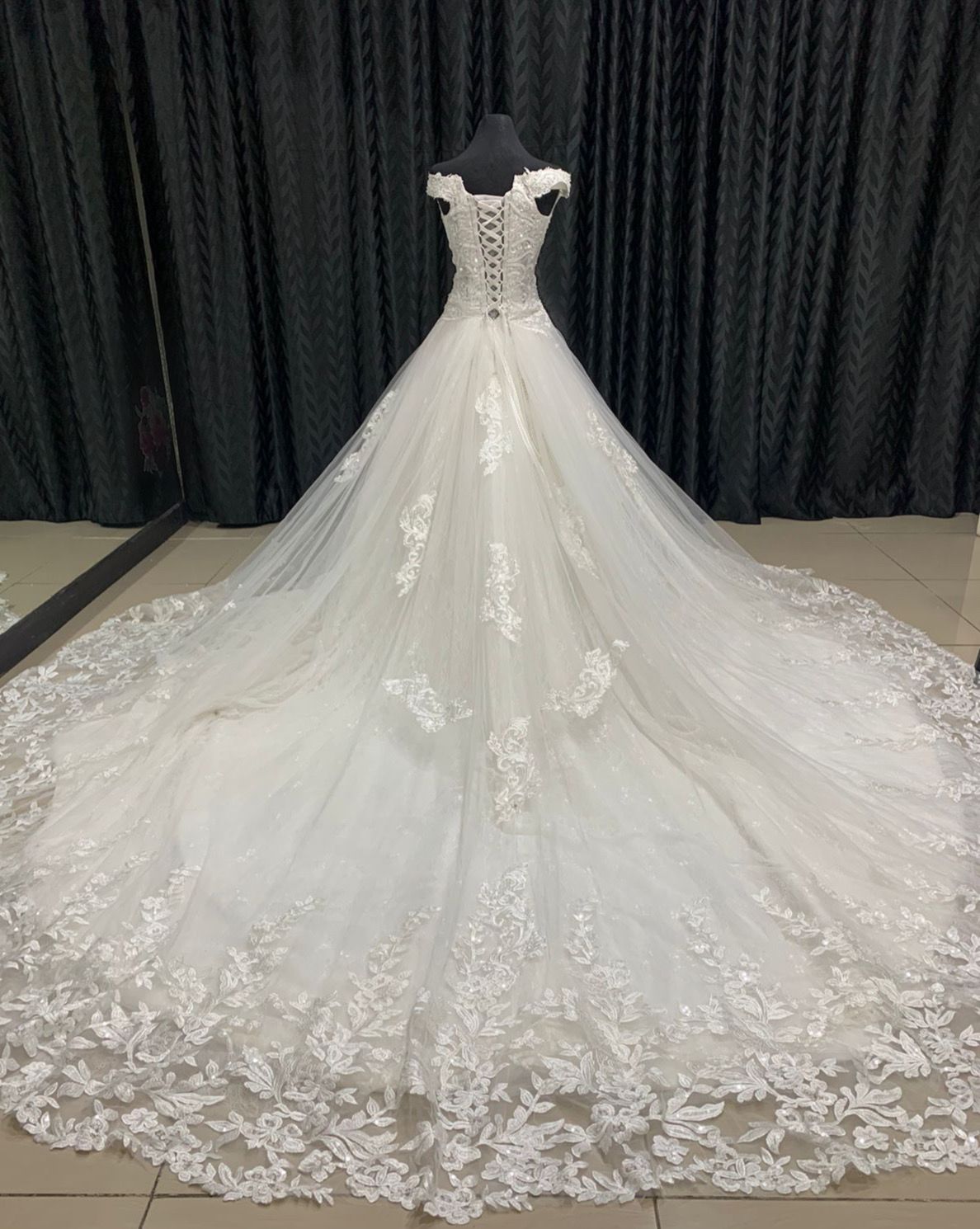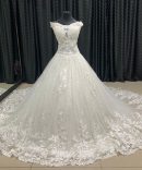 Vestido estilo princesa con transparencias, encajes sobrepuestos, corsetería, cola con cenefas, pedrería y cola larga.