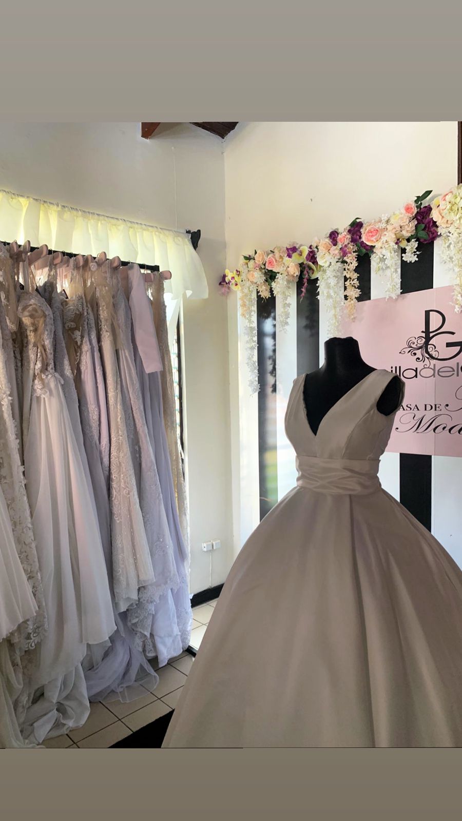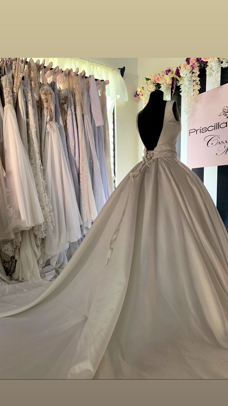 Vestido todo en raso con tirantes gruesos. Con cola.